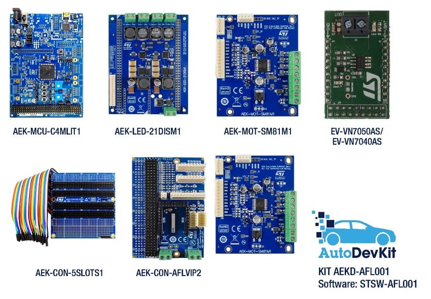 The AEK-MCU-C4MLIT1 serves as a base for the AEK-LED-21DISM1, which is a high-brightness LED driver board that uses an SPI interface to communicate with the host MCU. To move the headlights, we provide the AEK-MOT-SM81M1, an evaluation board that houses our programmable L99SM81V stepper motor driver, and to manage the load of the cooling fan we have the EV-VN7050AS, which integrates our a single-channel high-side driver that uses our VIPower M0-7 technology. Finally, there’s the AEK-CON-AFLVIP2 that helps connect everything by avoiding a wire by wire connection for a more practical approach that focuses on pins, and the AEK-CON-5SLOTS1 that will ensure manufacturers can test their design with their proprietary connectors and protocols.