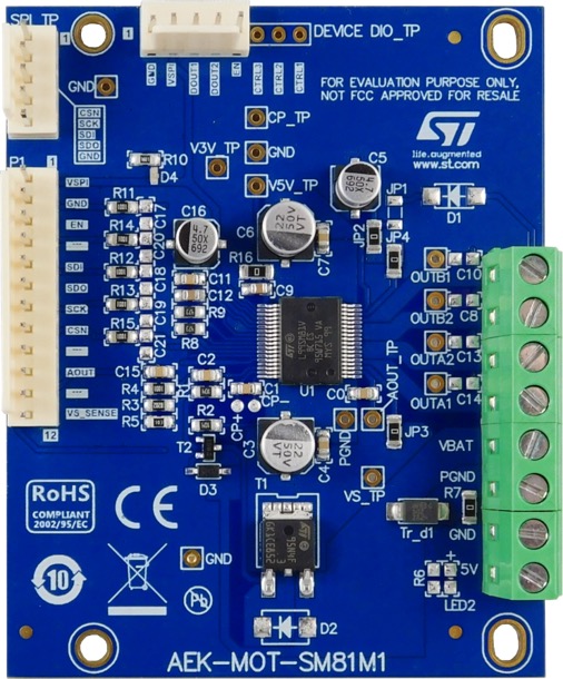 The AEK-MOT-2DC40Y1 can drive up to three DC motors, two bi-directional in parallel or three with proper sequencing. It features VN7 high-side switches and the VNH704AY integrated H-bridge motor driver. The documentation shows how to set up the motors and the configurations available. Additionally, developers can use the graphical user interface in AutoDevKit to manage rotation direction, start them, increase or decrease their speed, and more. The AEK-MOT-2DC40Y1 connects to an SPC5 MCU board, meaning integrators can rapidly design a proof-of-concept. Similarly, the AEK-MOT-SM81M1 also connects to an SPC5 board but features the L99SM81V stepper motor driver, while the AEK-MOT-WINH92 for window lifts uses the L99H92.