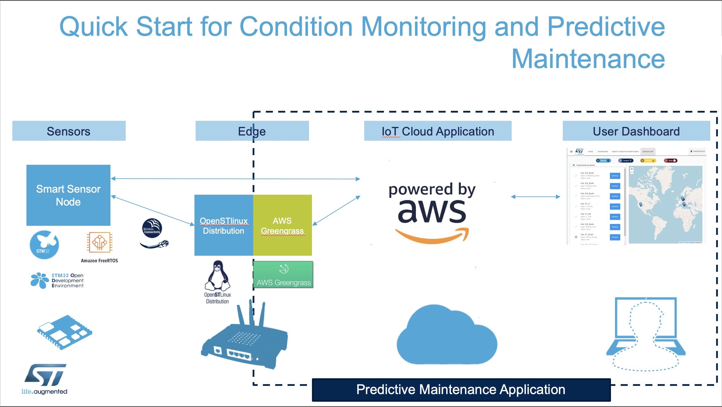 Coming up with a proof of concept starts by understanding the potential of a cloud-based solution. For instance, the STM32MP157C-DK2 (AWS Partner Device Catalog) can act as a gateway that can run AWS IoT Greengrass to connect to AWS services and use our predictive maintenance dashboard application to plot condition monitoring sensor data and configure triggers. Using the cloud doesn’t mean that everything falls if the Internet connection crashes. AWS IoT Greengrass can simulate a cloud to keep the platform functional until the system is back online. It can even process data locally, run updates, or take some actions instead of entirely relying on the Internet. Using an STM32MP1 gateway and AWS is thus about making more devices smarter and reliable to ensure that both condition monitoring and predictive maintenance solutions are more robust and flexible.