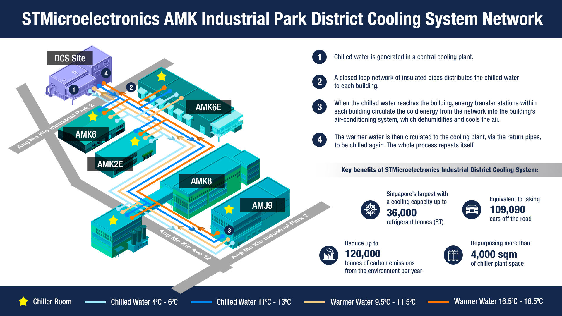 As promised in 2022, the District Cooling System at ST’s Ang Mo Kio (AMK) TechnoPark is now operational and on time (see our original article below). Ms. Low Yen Ling, Senior Minister of State, Ministry of Trade and Industry & Ministry of Culture, Community and Youth, who joined ST in announcing this project in 2022, now took part in the inauguration ceremony. This launch is a critical milestone in our goal to achieve carbon neutrality by 2027, and to work with local partners while also serving our communities as we move toward this sustainability objective.