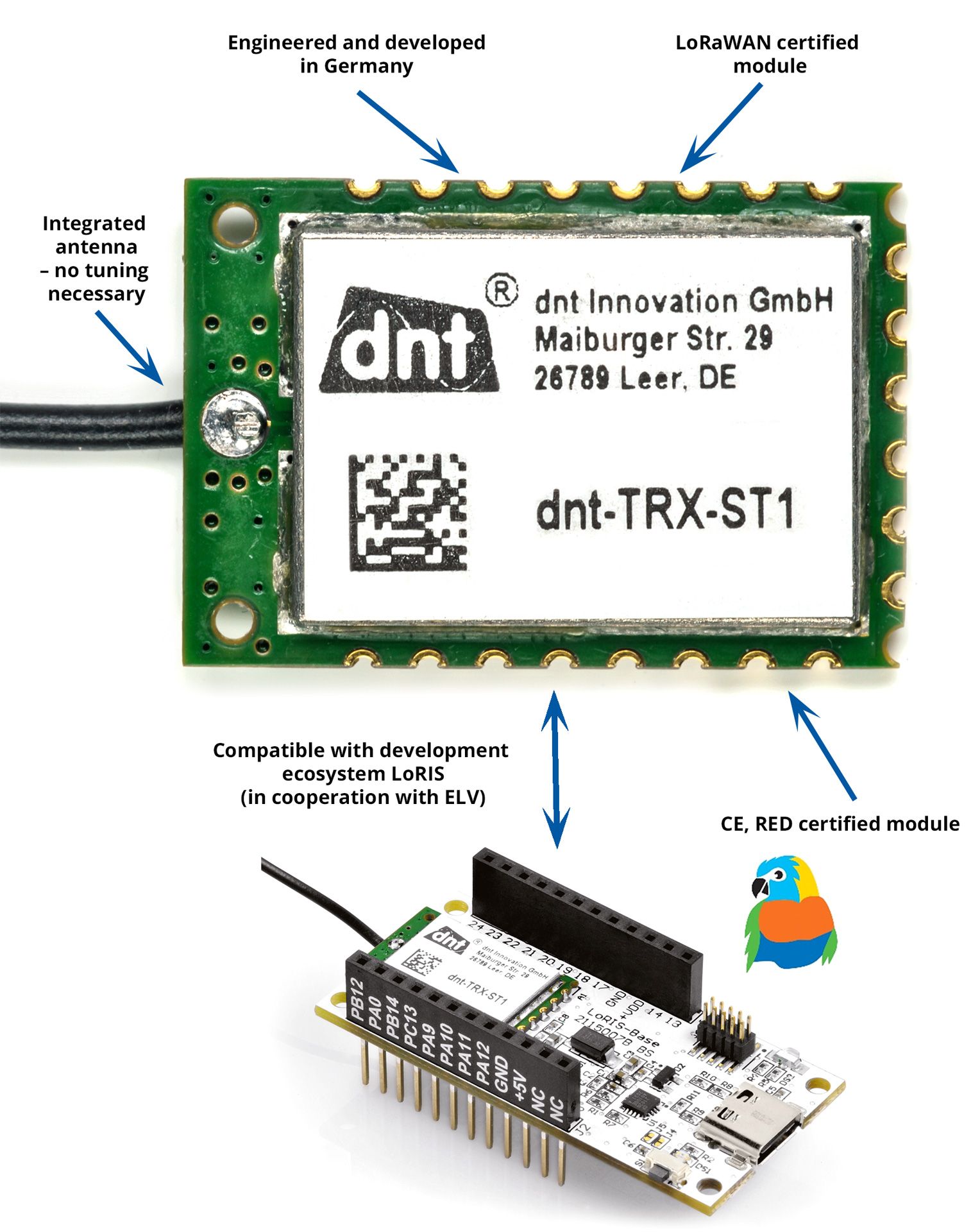 Too often, companies underestimate the importance of experimenting with technologies. Being able to build proofs-of-concept rapidly can have many long-lasting advantages. However, designing everything from scratch may discourage experimentations because every little trial demands massive investments. In cooperation with ELV Elektronik AG, dnt offers a solution to this issue with the LoRIS platform. Indeed, ELV Elektronik AG provides daughterboards that sit on top of the LoRIS-BM-TRX1. Some include GPS, while others feature energy harvesting or environmental sensors. Hence, engineers can try different applications, test low power settings with the button cell module, and more.