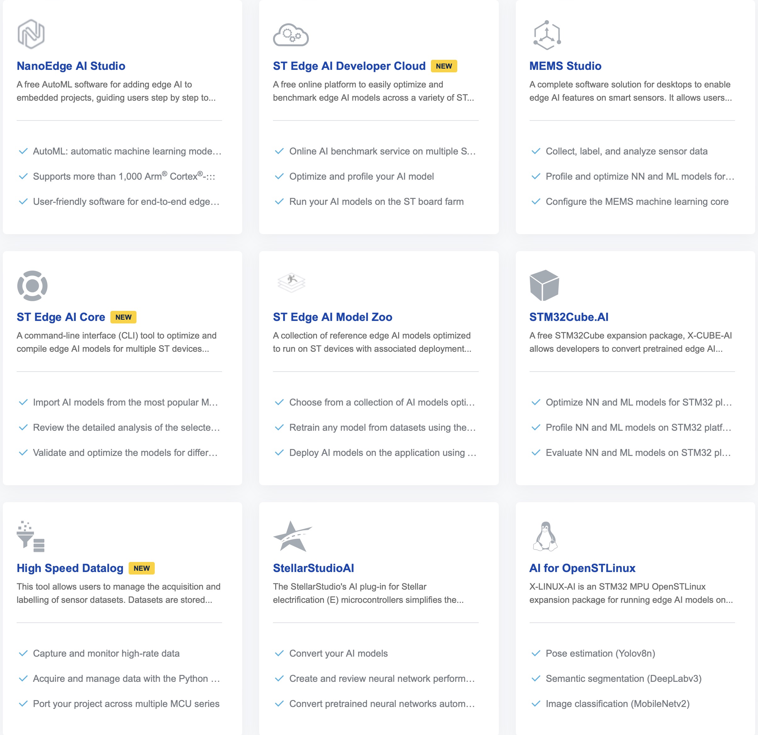 Most developers will appreciate that Edge AI Suite centralizes all our ST tools, especially because machine learning is such a multidisciplinary exercise. No developer should expect to do everything in one software. That’s why we created a suite showcasing all our solutions for data logging, model optimizations, code conversion, benchmarking, deployment, and more. Avid readers of the ST Blog are familiar with many of the tools listed on this page, such as NanoEdge AI Studio, STM32Cube.AI, X-LINUX-AI, MEMS Studio, the Edge AI Developer Cloud, or StellarStudioAI, which we featured in our piece on machine learning in cars. By centralizing these tools, we reduce the barrier to entry by ensuring that even developers with little experience know where to begin.