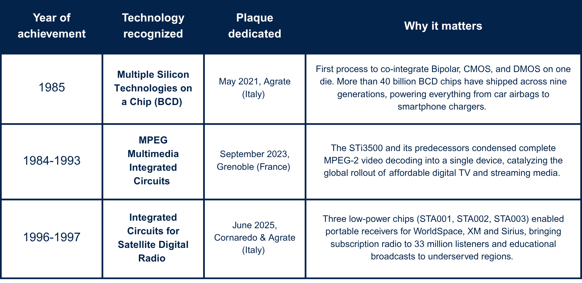 In 1799 Alessandro Volta showed the world how to store electricity, and a century later Guglielmo Marconi proved that radio waves could be transmitted across oceans. IEEE Milestone Plaques commemorate those breakthroughs and hundreds more, reminding us that progress happens when bold innovation, commercialization into products, and benefit to society converge. In June 2025 STMicroelectronics received its third plaque, following the ones for the BCD silicon process (2021) and the MPEG video decoder (2023). The third plaque recognizes the system of integrated circuits that made Satellite Digital Radio a commercial and humanitarian reality. The story behind ST milestones is an example of the dedication and teamwork that drive our labs.