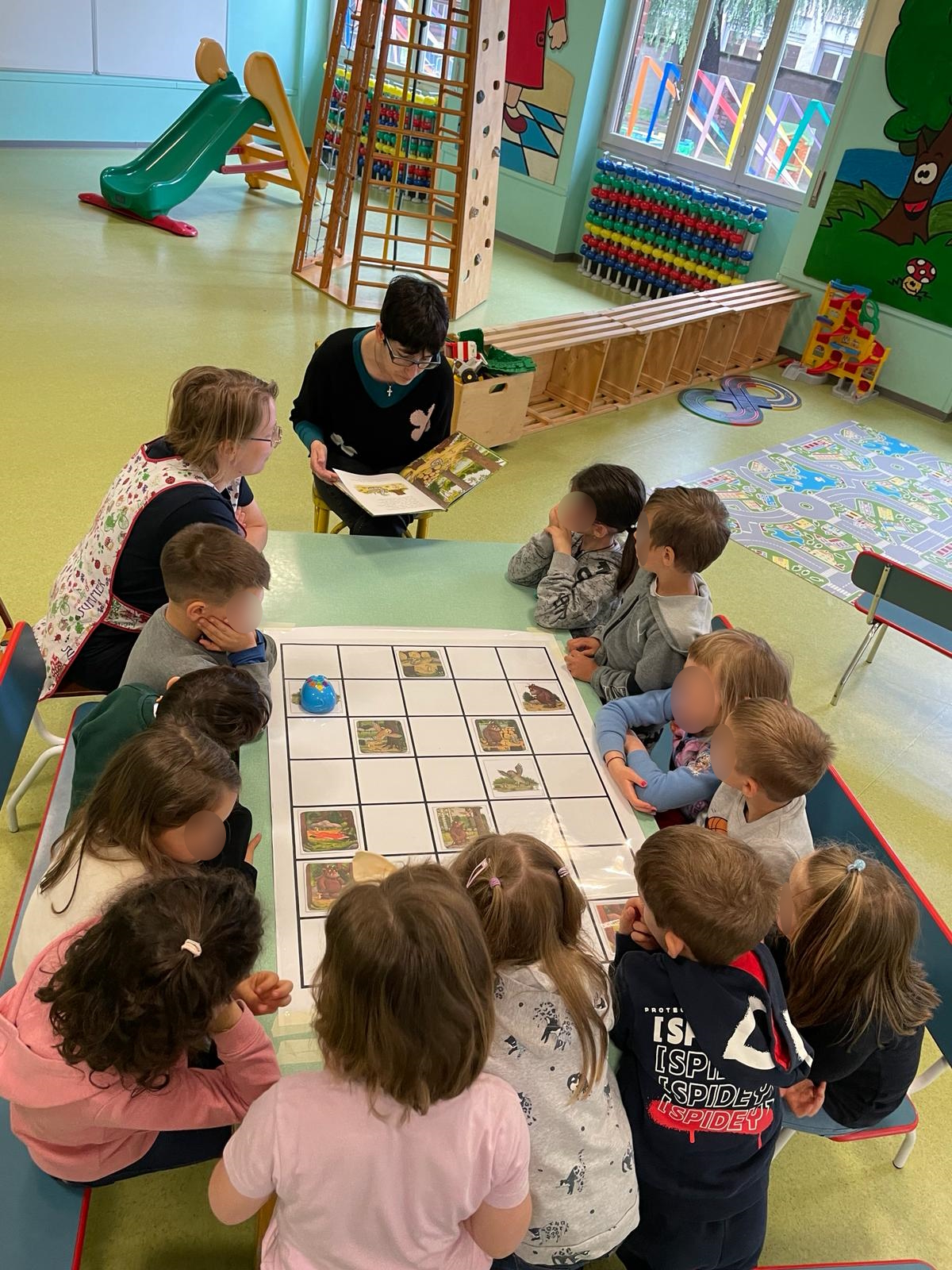 In this lesson, the ST volunteers are absent, and it is the class teacher who leads the activity. The goal is to stimulate creativity and group work through a real story. The teacher tells a story and the children, divided into 6 groups, must produce drawings representing a part of the story. Each group produces 2 drawings, for a total of 12 drawings to then apply on the paper grid that corresponds to 12 stages of the story.