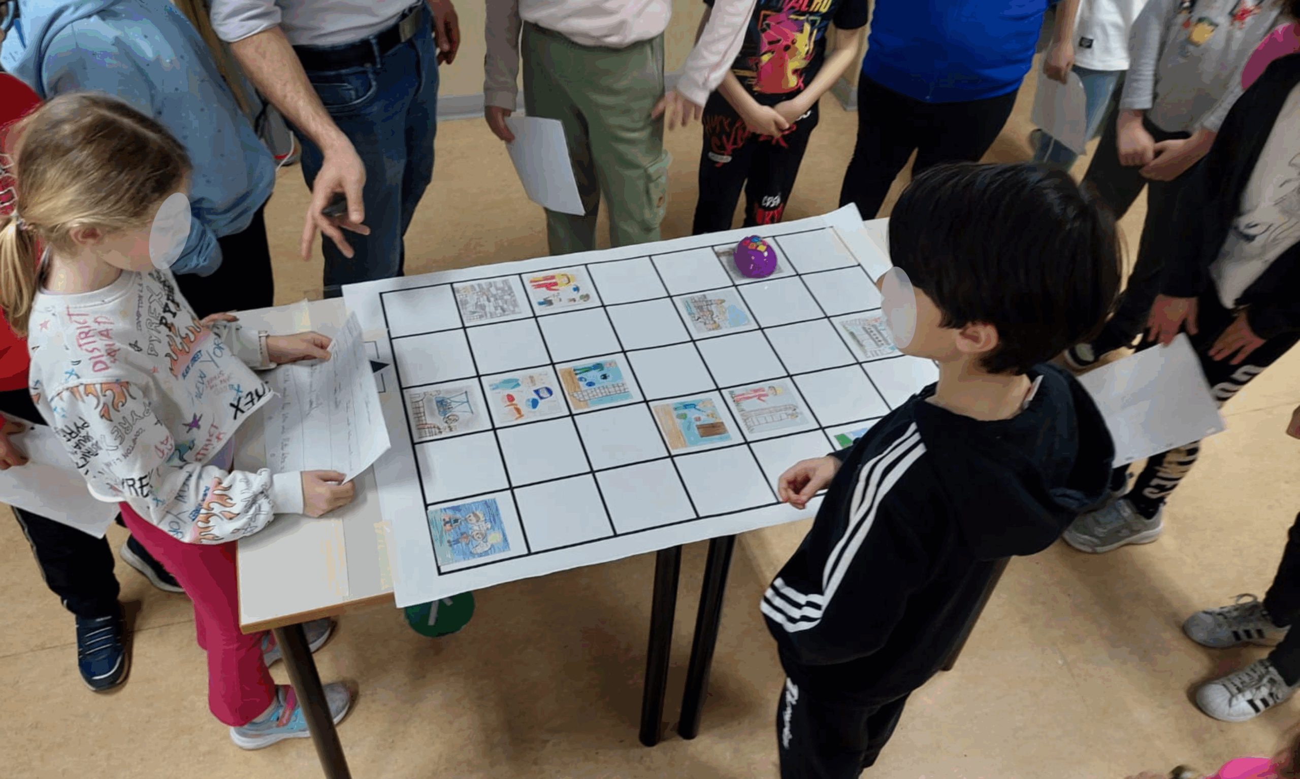 The children, still divided into 6 groups, write the code for the two stages of the story assigned to them (which correspond to the two drawings they created). Each group writes the code for their part of the story and checks it with the mouse on the grid. After this planning and verification phase, everyone reads the story together and moves the mouse, joining the various parts of the code written by the different groups.