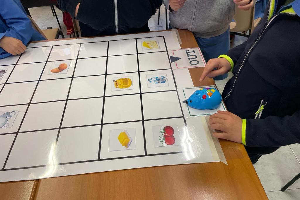 This mouse is 10 cm long and can memorize 40 commands. Specifically, the robot moves on an obstacle course, with the aim of proceeding from point A to point B while avoiding obstacles. The “problem solving” work is done at the desk in a group on sheets of paper while the verification part is done on the carpet where the children take turns to impersonate the robot. During the activity, programming sections and subsequent verification of the code are carried out: all the children can try to insert the commands, after having defined them on paper with their classmates, and see the result.