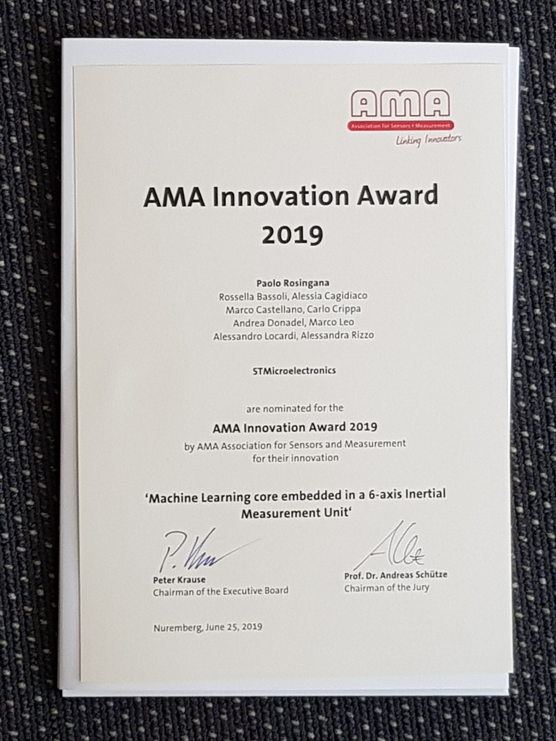 The AMA Association for Sensors and Measurement (AMA) nominated the LSM6DSOX as one of the four finalists of its AMA Innovation Award 2019 and recognized it as an outstanding project during the SENSOR+TEST conference that took place a few days ago in Nuremberg, Germany. The nomination promotes some of the most advanced devices in the industry and the jury appreciated the machine learning capabilities of the LSM6DSOX as it offloads the main microcontroller and thus saves tremendous energy. The decision tree enables the analysis, classification, and identification of patterns to make the sensor a lot smarter than competing components, thus transforming embedded systems.