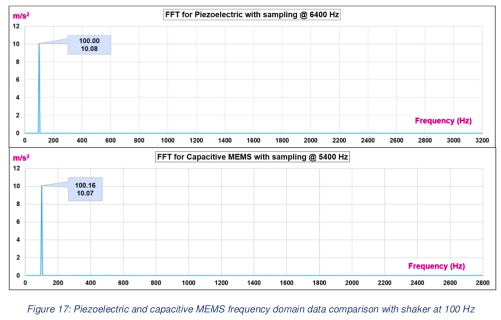 Piezoelectric accelerometers aren’t dead, and they continue to dominate the market when it comes to applications that require devices with extremely high bandwidths, which would be above 10 to 20 kHz. However, thanks to new developments, any system that benefits from accelerometers with 5 kHz sample rates can use capacitive MEMS. In fact, when we compared our IIS2DH device at 5.3 kHz sampling frequency against a piezoelectric sensor at 6.4 kHz sampling frequency, there weren’t discernible differences as the variations were trivial. The results are so close to one another that it is difficult to distinguish them, which means that for the first time in the industry, it is possible to say that relying on capacitive accelerometers for PdM has no downsides on applications that need a bandwidth compatible with capacitive MEMS.