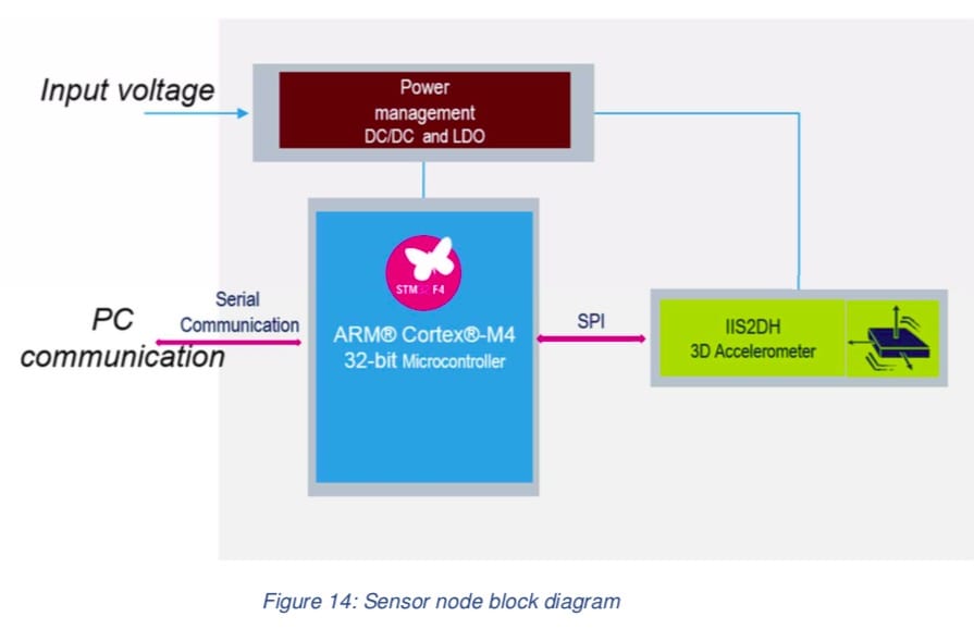 However, we also understand that groundbreaking benchmarks are one thing, but a practical application in the field is another. One doesn’t just drop a more cost-effective but equally performing accelerometer and expect the industry to adopt it overnight. This is why the paper from Alessandra, Giuseppe, and Alessandro is so crucial because it lays the foundation for an entire sensor node. Obviously, they understand that piezoelectric MEMS have a whole ecosystem around them with applications and Graphical User Interfaces to help engineers read their data and benefit from PdM. Hence the elegance behind their paper is that they also show how companies can reproduce an entire ecosystem with an STM32F4 microcontroller and a simple power management module. Just as with a piezoelectric MEMS, a node with the IIS2DH can connect to the USB port of a PC and send all the information necessary to the software.
