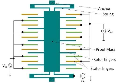 Capacitive sensors may not always be as popular or ubiquitous as their piezoelectric alter egos, but they are at the center of many technological advancements, especially in smartphones and other mobile devices. The technology relies on spring legs trapped between two stationary fingers that act as electrodes and measure electrical potential. Since the spring legs are attached to a proof of mass (or seismic mass) that moves under inertial force, they will get closer to one of the stationary fingers that will measure an increase in capacitance while the other detects a reduction, both enabling the determination of the direction and amplitude of the acceleration. Because capacitive MEMS use a much more complex architecture, they are harder to make.