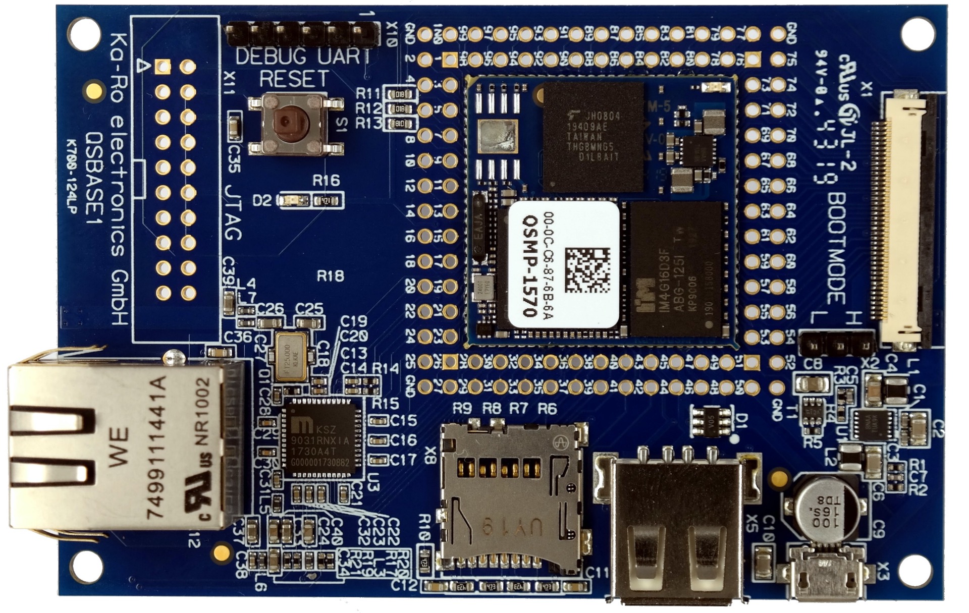 The QSMP Evalkit, while small, (60 mm x 90 mm), enables developers to enjoy all the features and power of the STM32MP1 before optimizing their system by only keeping relevant functionalities and determining the computational throughput necessary to run their applications. The QSMP Evalkit includes an Ethernet port, a USB port for power supply, an SD card slot for additional storage, a USB host, a TFT Display Connector, and solder pads for all of the 100 pins, thus fully opening up the SoM. Engineers can also solder a JTAG connector for additional convenience. Additionally, Ka-Ro can review custom design once engineers graduate from the evaluation board.