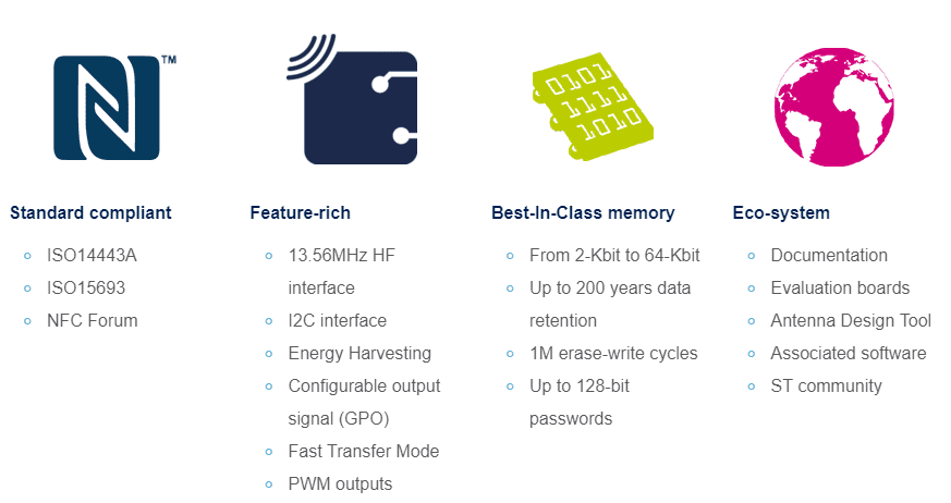 ST offers a full range of NFC tags to implement Bluetooth pairing. Our most flexible solutions are ST’s Dynamic I2C tags: ST25DV and M24SR. These dynamic tags are based on a dual-port EEPROM where one port is an I2C bus, and the other port is NFC. Since the contents of ST’s dynamic tags can be updated on the fly by the host, it offers many of the same capabilities of an active NFC transceiver, including the ability to: