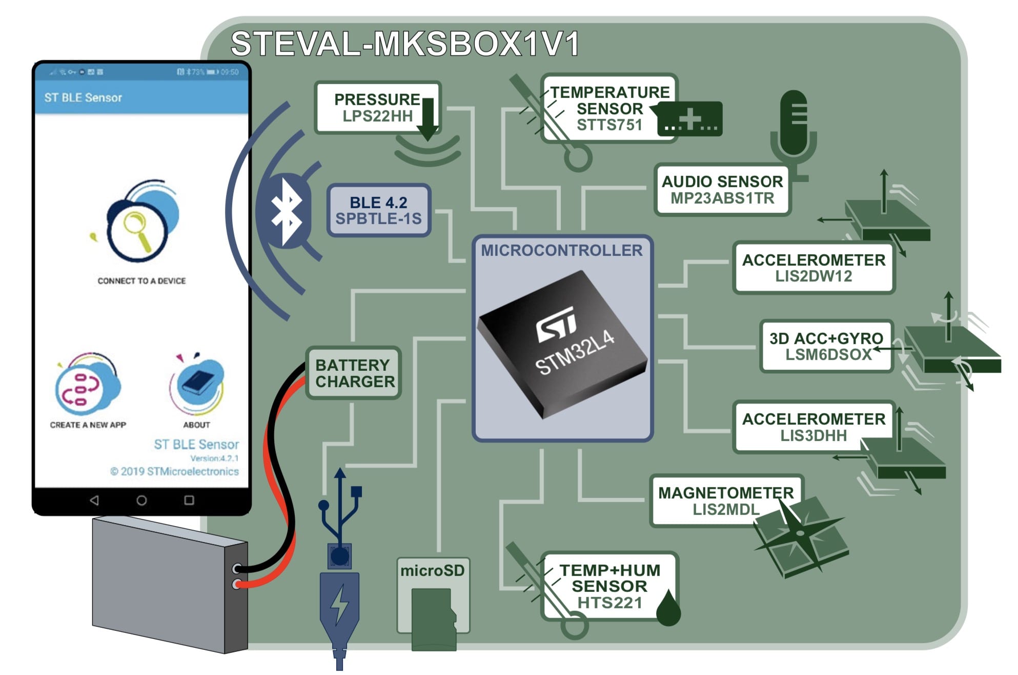 As the name suggests, the most apparent transformation of the new system is its form factor. The original SensorTile had a cradle to support the sensor board, and a plastic case to house the solution. The new SensorTile.box completely revisits its approach and encapsulates everything in a plastic case to resistant water splashes (IP54) and measuring only 57 mm x 38 mm x 20 mm. Despite its size, it offers a microSD card slot to use a memory card of up to 64 GB to store a lot more data than previously possible, it includes our lithium-ion battery charger STBC02 to facilitate the creation of mobile applications, and it is even compatible with ST-LINK V3, the latest architecture of our in-circuit debugger/programmer. Let’s now examine what’s inside this box.