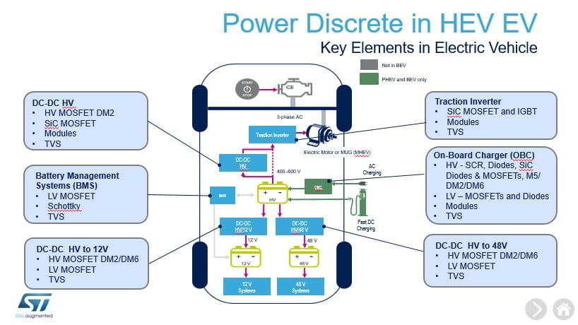 To meet the requirements of high performing, higher efficiency components for high voltage electrical systems, ST has developed a range of silicon carbide-based MOSFETs and diodes that are very conducive to automotive applications that require high voltage and high-density power conversion in a compact package.