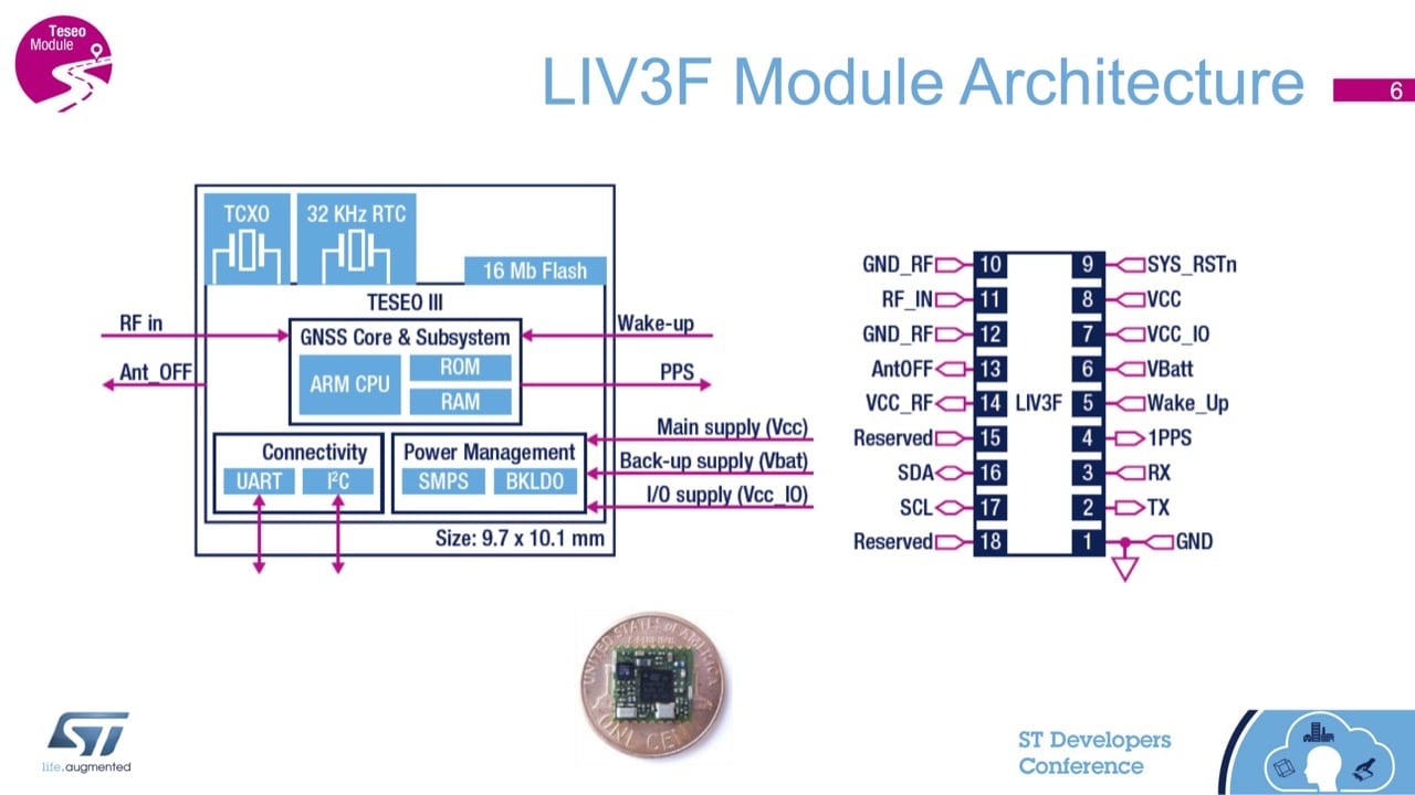 IoT (Internet of Things) was also at the center of many presentations. On top of the traditional sessions everyone expects, such as those delving into LoRa and SigFox, other presenters tackled the issue from a different perspective. For instance, a session showed how connected devices could take advantage of the Teseo LIV3F, a very small (9.7 mm x 10.1 mm) multi-constellation GNSS (Global Navigation Satellite System) module that includes a 16 Mbit Flash to allow for data logging (12 hours of data at 1 Hz). Fast and precise thanks to its 26 MHz Temperature Compensated Crystal Oscillator (TCXO), which gives it a serious advantage over chips that just use crystals, it can even predict its position for up to 6 days if the satellite signal and connection to the Internet is no longer available.