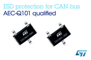 For example, here’s the datasheet of ST’s ESDCAN0x-2BWY. This device is compliant with all key interfaces in automotive applications, including CAN-FD (Flexible Data Rate). It complies with the standards ISO10605/IEC61000-4-2: >25kV air/contact as well as ISO7637-3a/3b and is AEC-Q101 qualified.