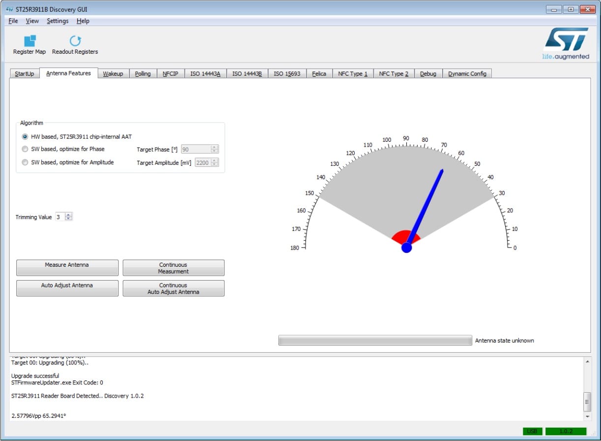 ST has greatly simplified the setup and configuration of the ST25R3911B-DISCO by providing the STSW-ST25R001 software, which offers a Graphical User Interface (GUI) for Windows. It can tweak the Automatic Antenna Tuning system, mentioned above, and more quickly implement one of the many standards supported. It is available for free, and ST provides further documentation to guide users through the firmware upgrade process, and the many settings available.