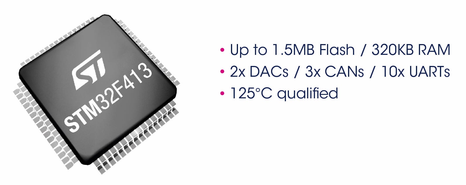 There are many more features included in the STM32F413/423, such as the Quad SPI interface to access off-chip memory and peripherals, a Floating-Point Unit, DSP instructions, and a serial audio interface, or an LCD interface for 16-bit QVGA or 8-bit WQVGA screens. To top it off, these MCUs offer different low-power modes to ensure designs remain extremely power-efficient.