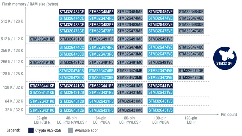 The STM32G4 microcontroller series is the first ever to include five analog-to-digital converters, seven digital-to-analog converters, six operational amplifiers, and seven comparators, while also integrating a USB-C Power Delivery controller, a 184 picoseconds high-resolution timer, CAN interfaces with flexible data rate, and math units accelerating certain trigonometric functions. Near the STM32F4 when it comes to computational throughput, the STM32G4 remains alone in the “mixed-signal” MCU segment by offering new and optimized features for both digital and analog applications. Its Cortex-M4 will reach up to 170 MHz to obtain 213 DMIPS, and 550 points in CoreMark while its numerous architectural improvements enable the creation of simpler yet more robust designs. We are also using two different dies at launch to offer the broadest range of pins and memory configurations possible right from the start.