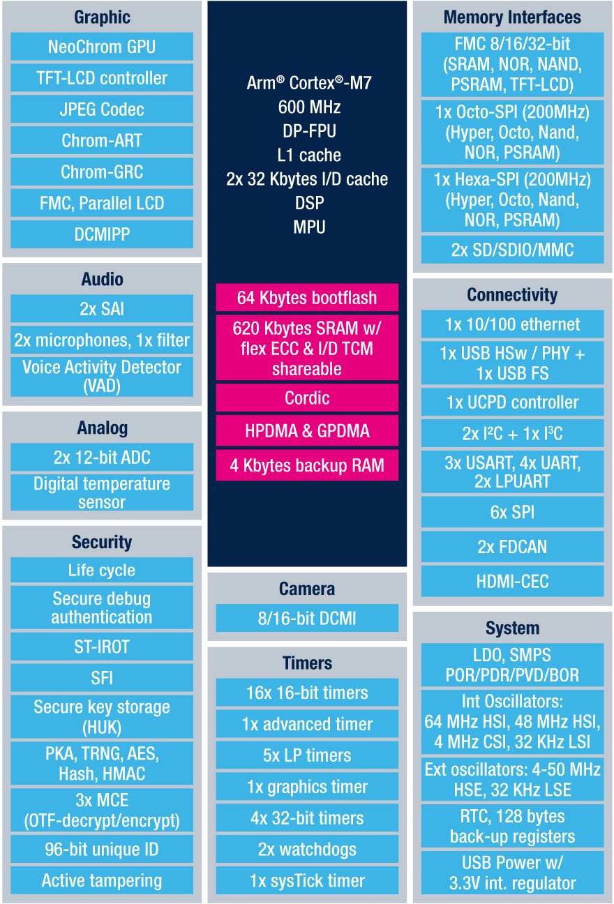 The STM32H7R and STM32H7S are the fastest STM32 MCUs at 600 MHz and the most cost-effective STM32H7s, thanks to their smaller flash memory. They target integrators who must use external storage and will, therefore, be able to lower their bill of materials by choosing an MCU better tailored to their needs. Additionally, while there’s less flash, the STM32H7R and STM32H7S are the first to support bootflash instead of the traditional boot ROM. Some also offer a NeoChrom GPU. Consequently, as consumers demand that embedded systems get better graphics, thus forcing designers to rethink their hardware configuration, the STM32H7S and STM32H7R are making rich and modern UIs far more accessible.