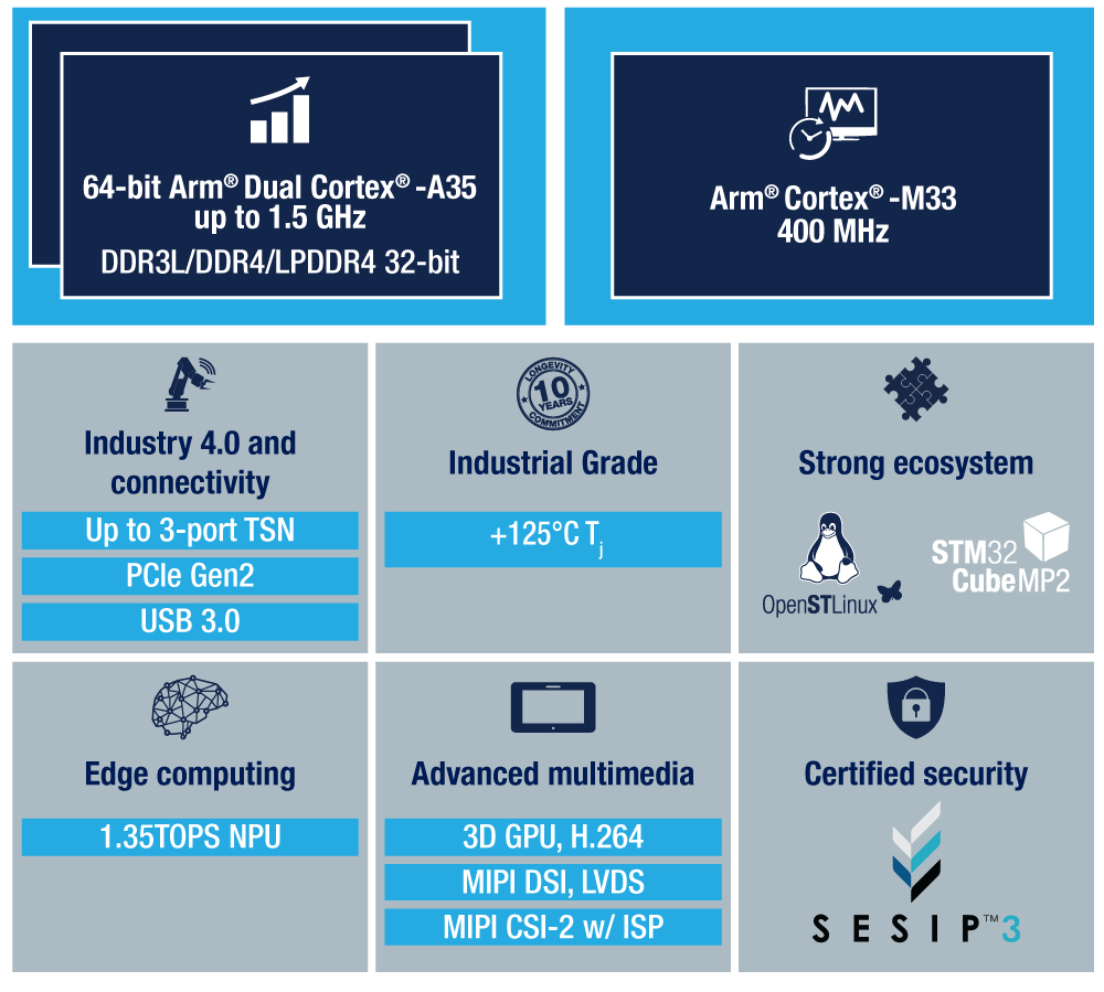 An overview of the STM32MP2 shows that the devices will include one or two Cortex-A35, depending on the versions that will hit the market, and one Cortex-M33. While the Cortex-M will run at up to 400 MHz, the Cortex-A will reach up to 1.5 GHz. We chose this MPU because it remains the most energy-efficient and cost-effective 64-bit Cortex core today. It is also backward compatible with 32-bit architectures, so users can run legacy code as if on our previous generation of devices. Astute readers will also notice some similarities with the STM32MP13, our most affordable and fastest single-core MPU when it comes to certain peripherals or security features.