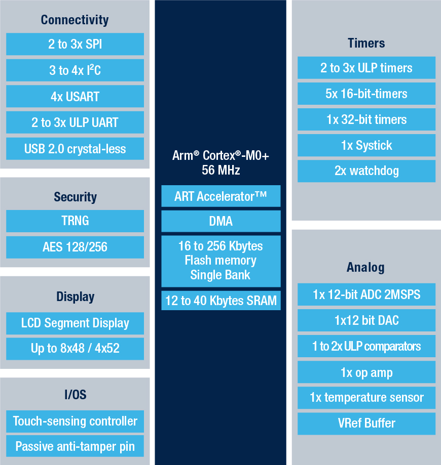 To make this entry-level device even more compelling, ST maximized the number of integrated peripherals. We include a segment display controller, so engineers don’t have to add an external one. Similarly, very few competing devices offer digital-to-analog and analog-to-digital converters, an operational amplifier, and an ultra-low power comparator. Consequently, developers can provide new features to their users that they weren’t originally going to offer, or they can ship the same features at a lower price, making their product more accessible.