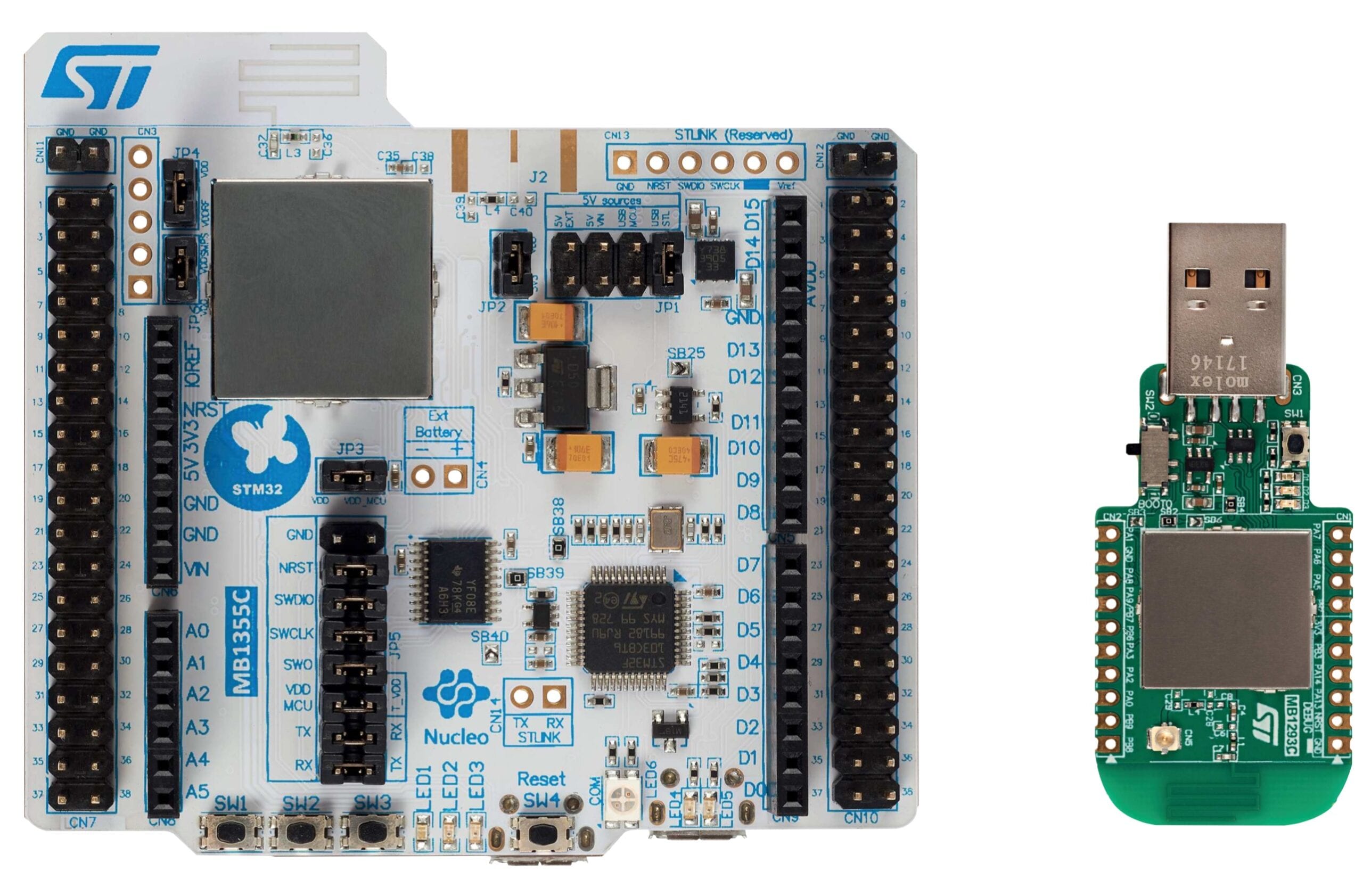 The best way to start experimenting with the new STM32WB family of MCUs is to get the P-NUCLEO-WB55, a development pack that offers two STM32WB55: one on a Nucleo64 board, which uses a QFN68 packaging and one on a USB dongle, which uses a QFN48 housing. The MCU on these two products serves as a superset, meaning that developers can start writing their application, then use STM32CubeMX to see if they can lower the pin count, use a component with less memory, or reduce the clock speeds to simulate a device with different specifications and see what configuration works best for them.