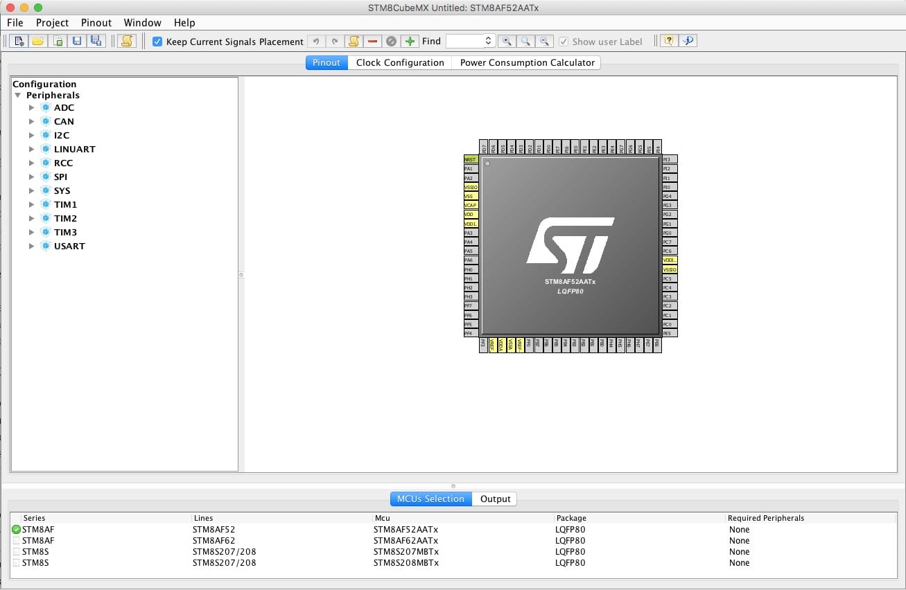 One of the strengths of ST’s offering is the ability for engineers to switch from one MCU to another with very little modifications to their application’s code. As the chips are pin-to-pin compatible, they can easily change component for something more powerful, or requiring less energy, and still benefit from the settings of the previous MCU. STM8CubeMX employs the same philosophy by offering a tab called “MCUs Selection”, at the bottom of the Pinout view, the first interface displayed after choosing an STM8 MCU. It contains a list of chips that can easily be swapped in favor of the one currently selected. It is then possible to choose another component, import all the work previously saved, and the software will automatically apply all the modifications and customization to the new MCU.