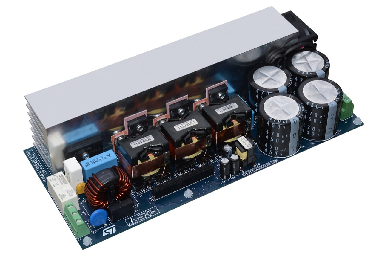 A recurring theme on the blog is that ST isn’t simply a component manufacturer, but a company that goes far beyond what the competition offers to help engineers make the right choices and quickly reach optimal designs. As a result, the company doesn’t only provide one of the most feature-rich PFC controllers on the market, it also offers an evaluation kit based on the STNRGPF01, the EVAL-IPFC01V1, to greatly accelerate developments. This 3 kW three-channel interleaved PFC is composed of a power board, a control module, and an adapter. It is thus the easiest way to start developing a power supply that will meet the IEC 61000–3–2 standards.