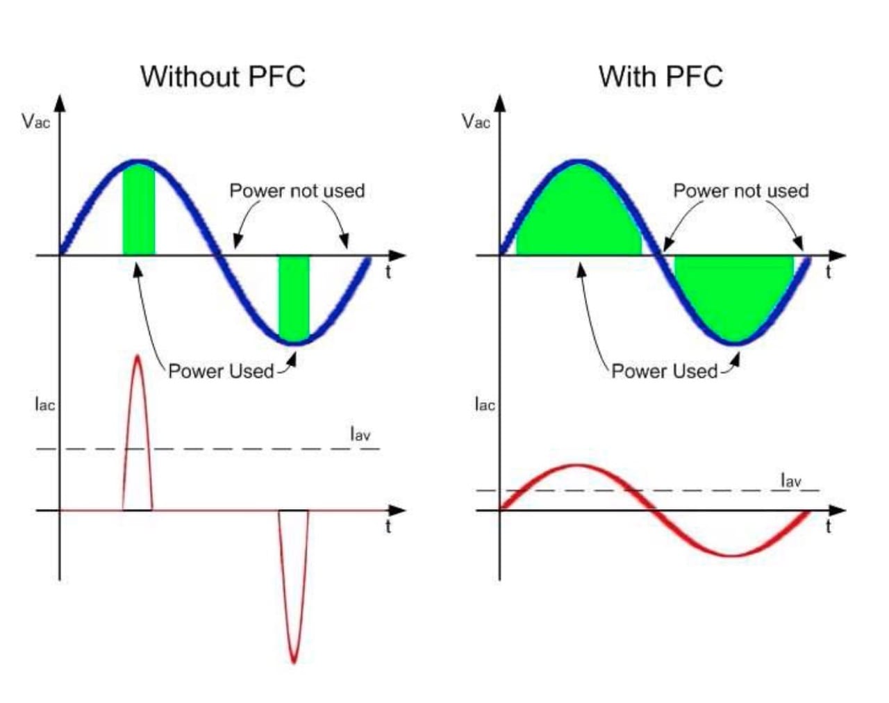 Without and With PFC. White is the reactive power, green is the real power, and blue is the total or apparent power (Click to enlarge)