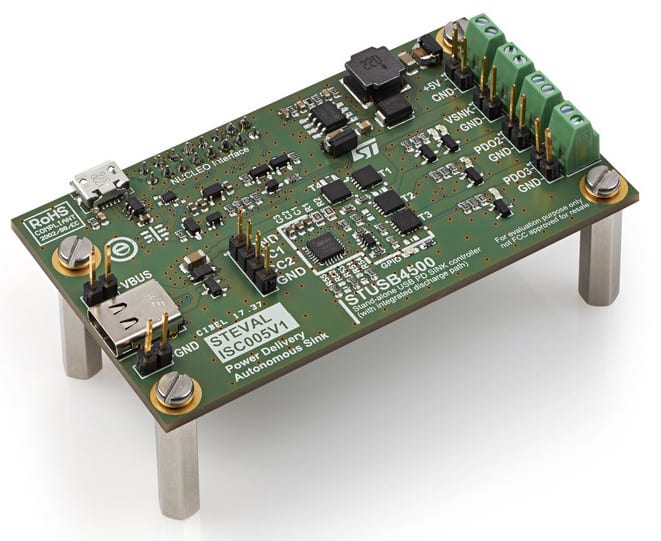 To start experimenting with the STUSB4500, developers can get a traditional STEVAL-ISC005V1 evaluation board that comes with the controller, multiple output paths, and a way to connect to the NUCLEO-F072RB. It targets teams that want to test the totality of the component’s features, meaning low and high voltage applications. The board also includes a 5 V DC-DC converter to use a single 20 V supply to power everything, from the USB charging system on the board to an external MCU or a motor. As a result, developers can immediately start building a vast range of prototypes since it contains all they need to get an embedded system of the ground.