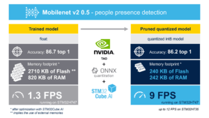 NVIDIA announced today TAO Toolkit 5, which now supports the ONNX quantized format, thus opening STM32 engineers to a new way of building machine learning applications by making the technology more accessible. The ST demo featured an STM32H7 running a real-time person-detection algorithm optimized using TAO Toolkit and STM32Cube.AI. The TAO-enabled model on the STM32 system determines whether people are present. If they are, it wakes up a downstream Jetson Orin, enabling significant power savings. For such a system to be viable, the model running on the microcontroller must be fast enough to wake up the downstream device before the object leaves the frame.