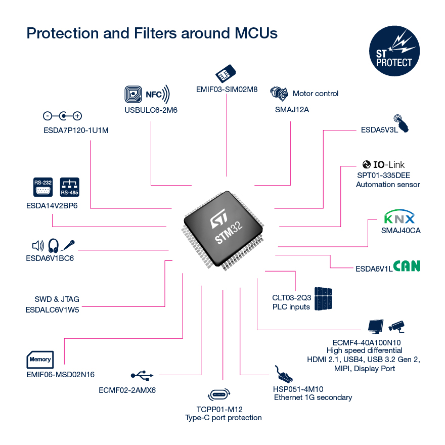 The TCPP01-M12 protects USB Type-CTM ports in sink mode (charging) against overvoltage of up to 24 V on VBUS, 6 V on CC lines, and against electrostatic discharges on the connector pins, among other things. TCPP stands for Type-C Port Protection, and the TCPP01-M12 works as a companion chip for our STM32 MCUs with built-in USB-C Power Delivery (UCPD). Hence, using an STM32G0, STM32G4, STM32L5, or STM32U5, and the TCPP01-M12 is significantly more cost-effective than a bundle of external devices. The TCPP01-M12 also distinguishes itself thanks to a null quiescent current when nothing is connected to the port.