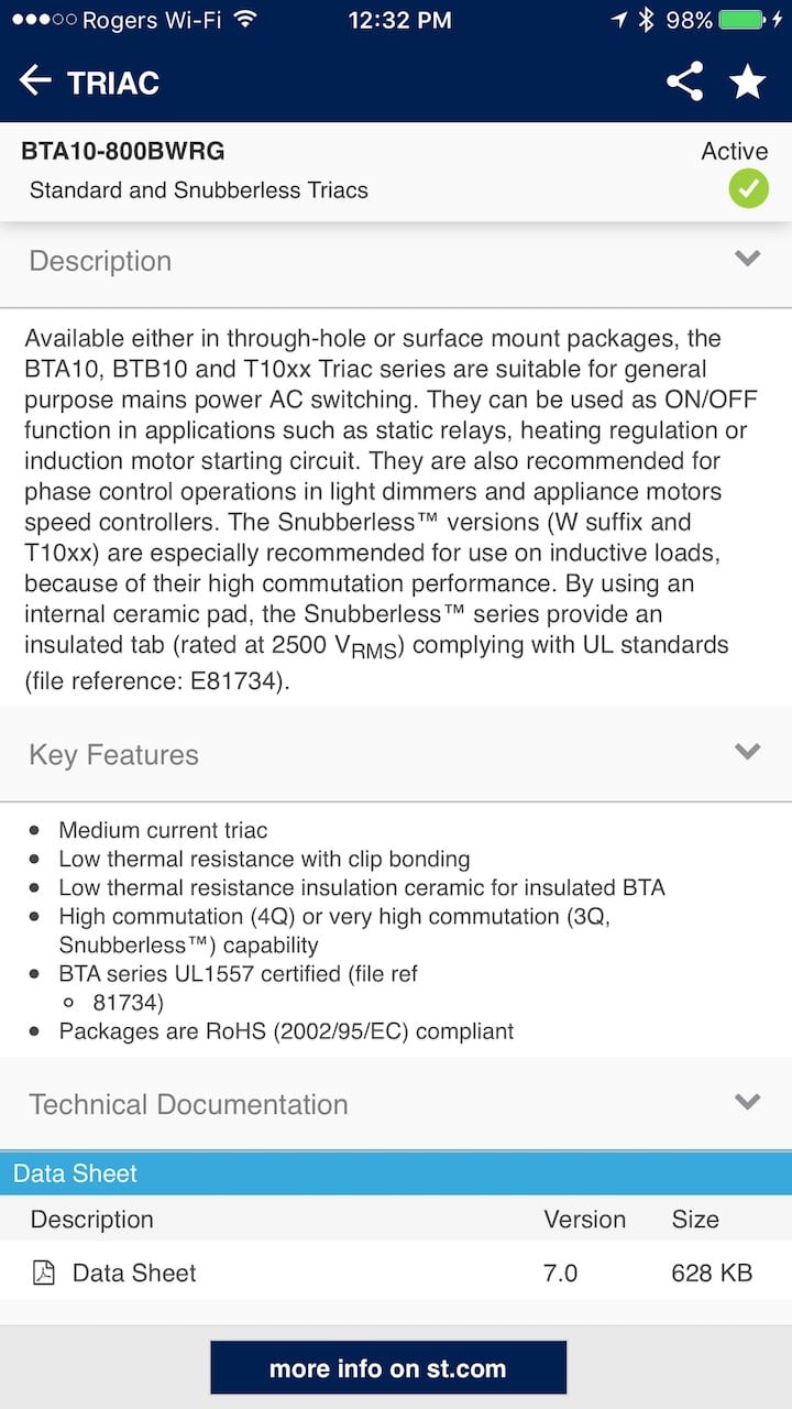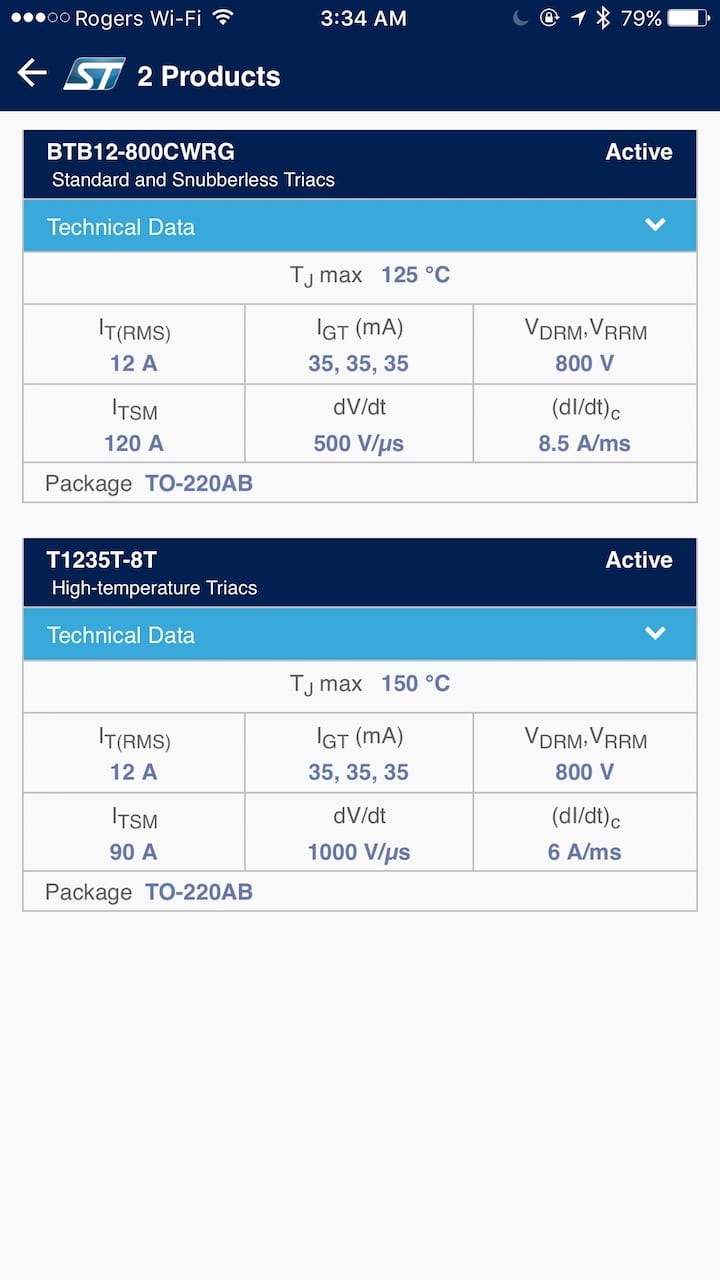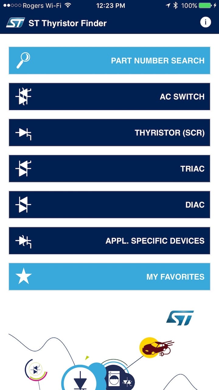 Thyristor Finder is the newest mobile application from ST. It makes finding the right thyristor for your design a breeze by simplifying the selection and integration of the right component, and it is currently available on iOS and Android. Crowdfunding offers fresh opportunities and exposure to small teams, allowing them to disrupt markets. However, it also means newcomers, who often have fewer resources or experience, must face design challenges that only big corporations had to deal with previously. One example is understanding the importance of thyristors or AC switches, and finding the right one in a sea of part numbers and specifications. This is the reason why ST isn’t simply manufacturing thyristors, but also sharing its knowledge and expertise through an unparalleled mobile app, support, and online community.