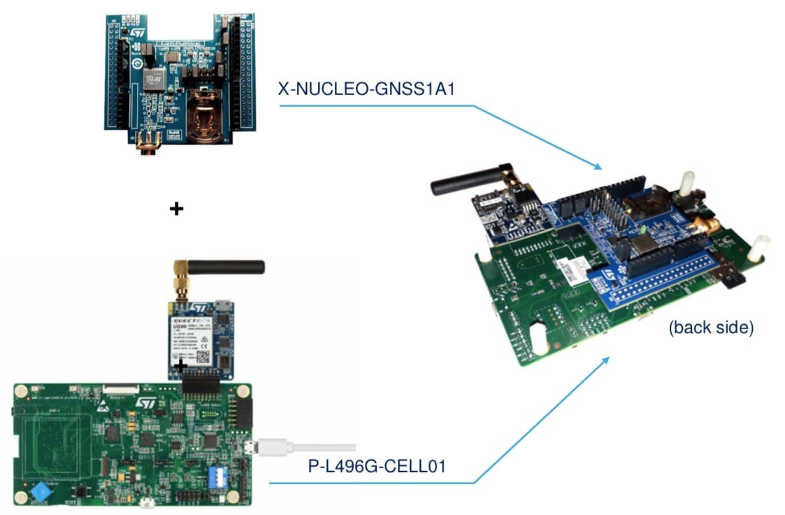 The binaries that we precompiled use the cellular modem of the Quectel UG96 daughter board to connect to the TomTom servers. The easiest solution is thus to get the P-L496G-CELL01 Discovery Pack, which includes the modem and a motherboard almost identical to the 32L496GDISCOVERY, but without the display, making this our most feature-rich cellular discovery kit ever. Developers who own the cellular modem can also use it with the NUCLEO-F401RE. However, since the Quectel card uses our STMod+ connector, they will have to plug in the X-NUCLEO-STMODA1 card first to add the necessary interface. Additionally, the jumper JP5 needs to be in the U5V position on the Nucleo board. Finally, users need to place our X-NUCLEO-GNSS1A1 board at the top of the stack and drag and drop the correct binary to load it onto the microcontroller.