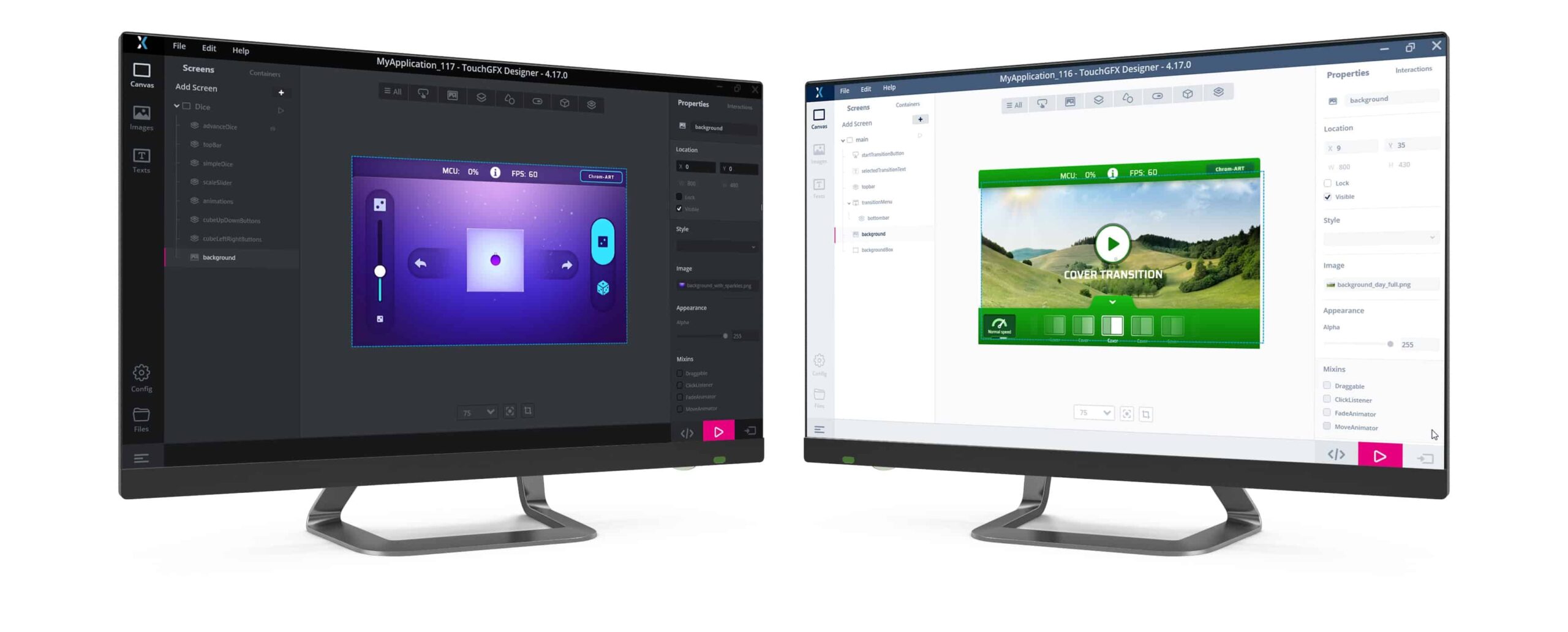 One example is a dice that demonstrates how to efficiently use texture mapping. The demo shows how to optimize a system when switching from 2D to 3D or zoom in and out. A second example is a new screen transition demonstration featuring a list of animations. Lastly, TouchGFX 4.17 also contains ninja robot game showing interesting effects that only require simple bitmap graphics. TouchGFX Documentation is already up-to-date with new guides and screenshots of TouchGFX Designer 4.17. Developers thus can thus rapidly become familiar with the new interface and be confident that we will walk them through future changes as we make them.