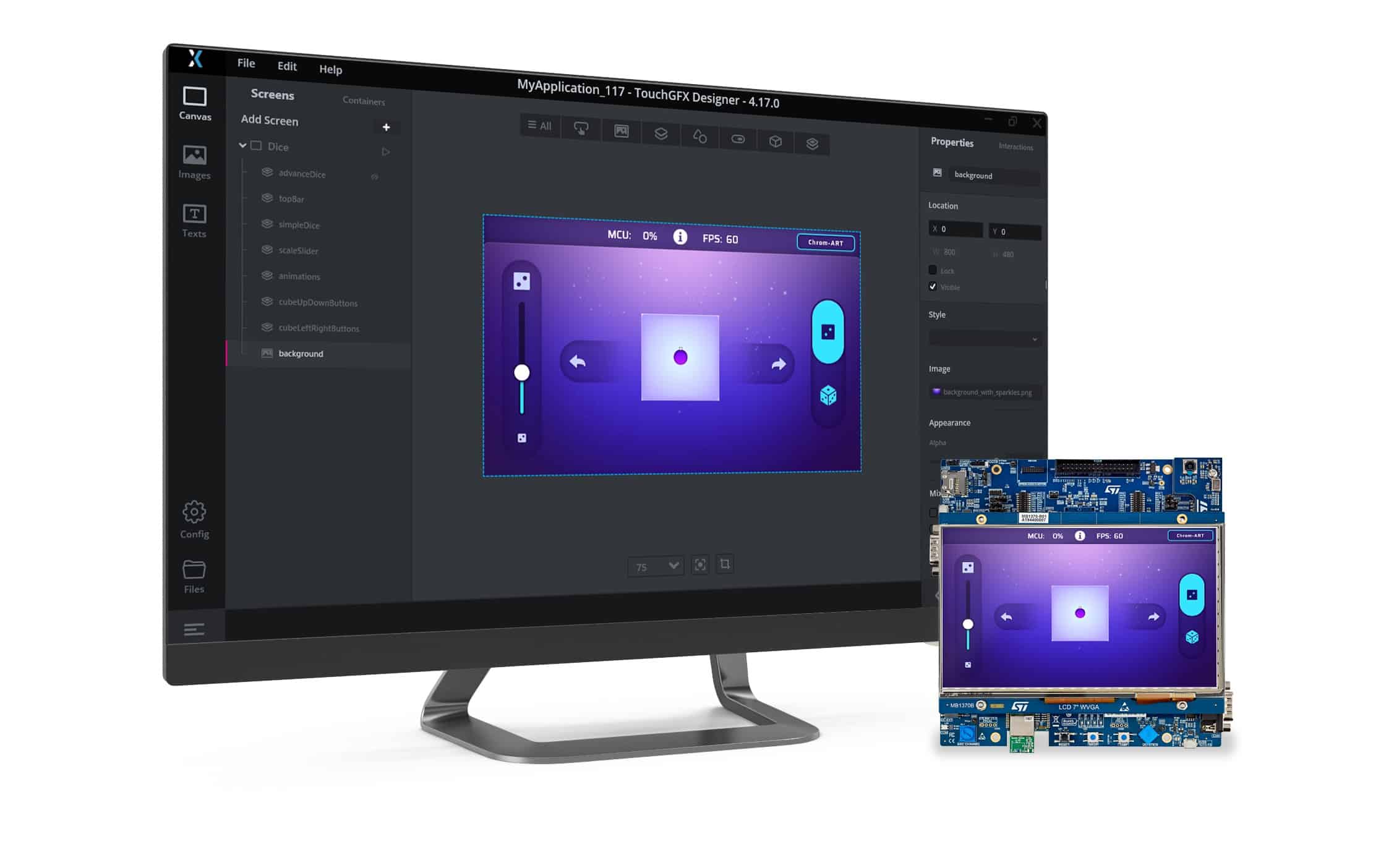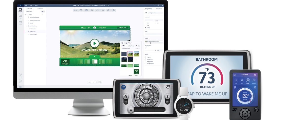 TouchGFX Designer 4.17 is unique because it represents a significant chapter since ST acquired TouchGFX in 2018 and since TouchGFX 4.13 became a member of the X-CUBE family in 2020. The new version is now using a color palette similar to that of other ST utilities. It also represents a new direction that better optimizes processes. For instance, new icons at the top of the screen help access various categories quicker. Hence, with the latest version, inserting an image is as straightforward as clicking an icon and selecting files. Similarly, all properties are now present in a panel on the right side of the screen for easier access. Developers can thus expect a more organic system with far fewer frictions.