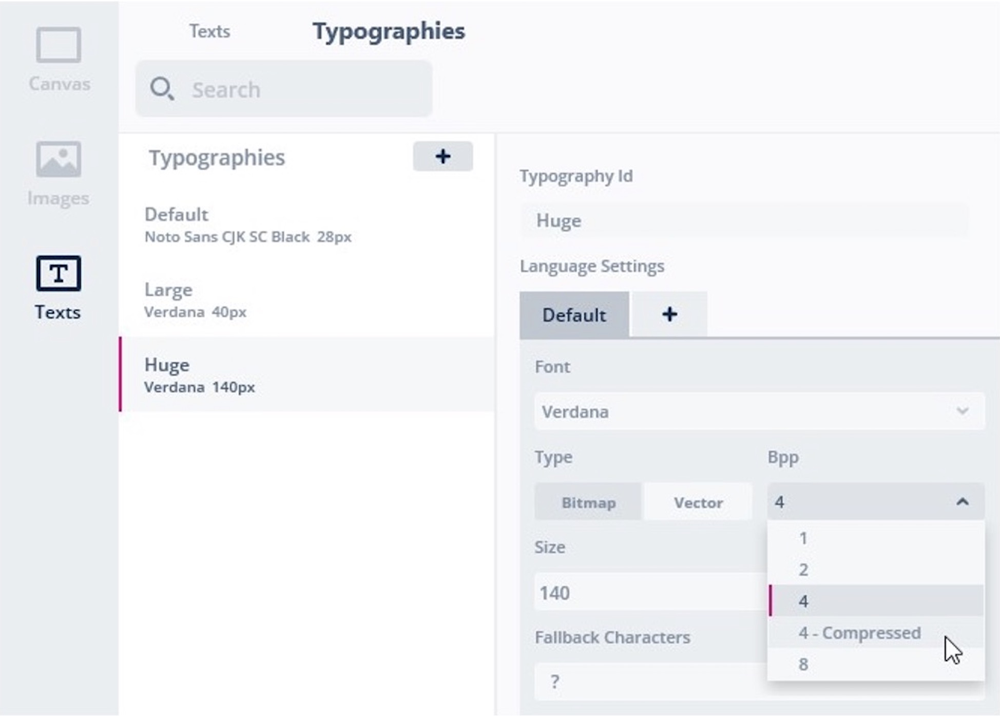 TouchGFX Designer also includes a Typographies option to set default parameters within groups. The section lets users choose font specifications, fallback characters, wildcards, alignment, etc. Previously, developers had to overwrite parameters for each text resource, which could be a lot of work. Thanks to groups, it’s possible to simultaneously set parameters for many resources, thus vastly optimizing developments. Existing projects with custom typographies will see their settings move to the new section. The new text interface also displays single-use texts and enables their promotion to a resource if necessary.