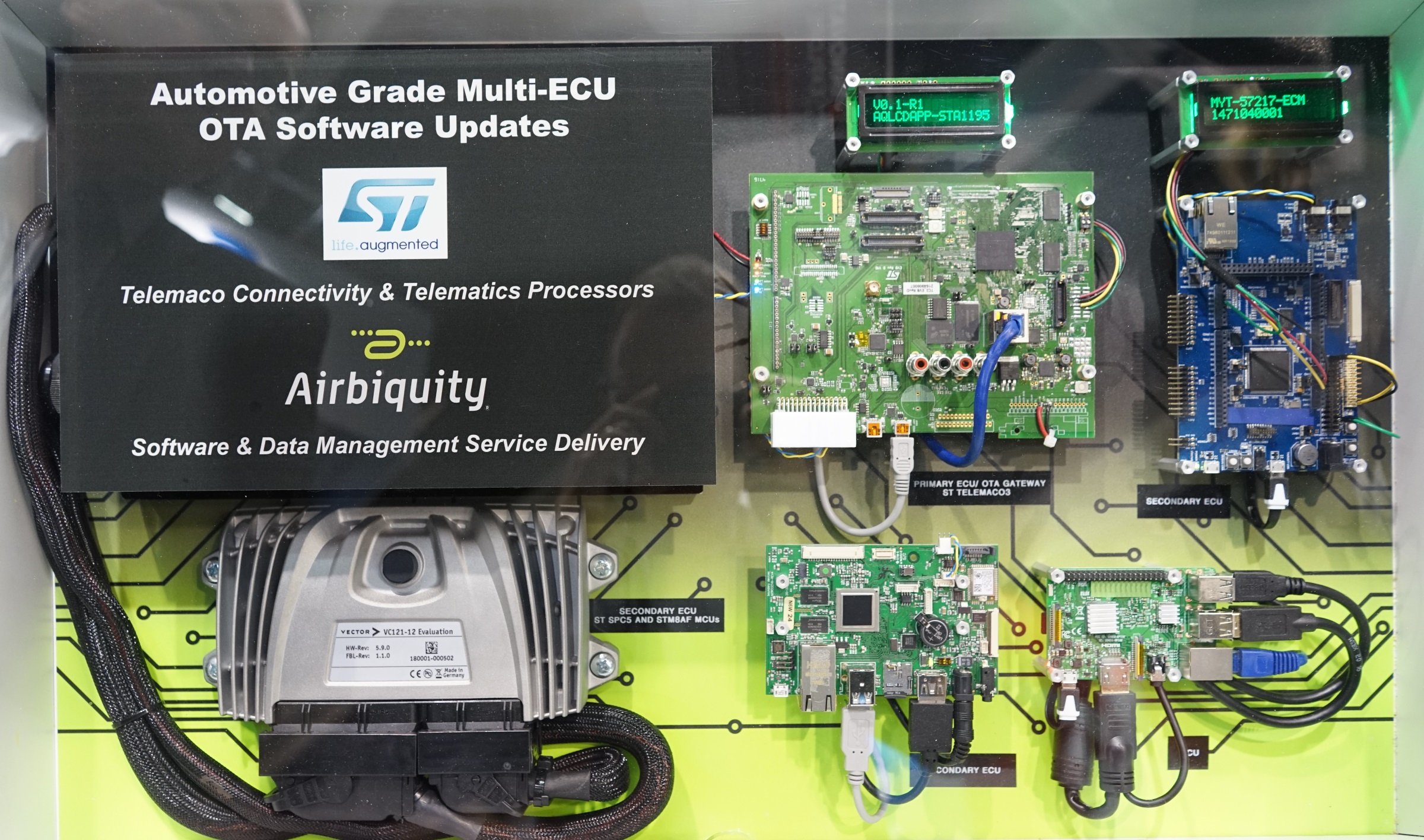 The connectivity of modern vehicles makes them increasingly dependent on electronic control units (ECUs) and microcontrollers. The rising intricacy and complexity of managing software updates and data collection for millions of vehicles around the world is becoming a key challenge. To address this, we invited our partner Airbiquity to demonstrate their solution, which provides real-time software update over-the-air (SOTA) for vehicles and has already been used to provide nearly 4 million updates in over 50 countries around the world. The live demonstration used a combination of automotive-grade high-performance telematics processors and ECUs from ST and robust and secure over-the-air (OTA) software and data management from Airbiquity.