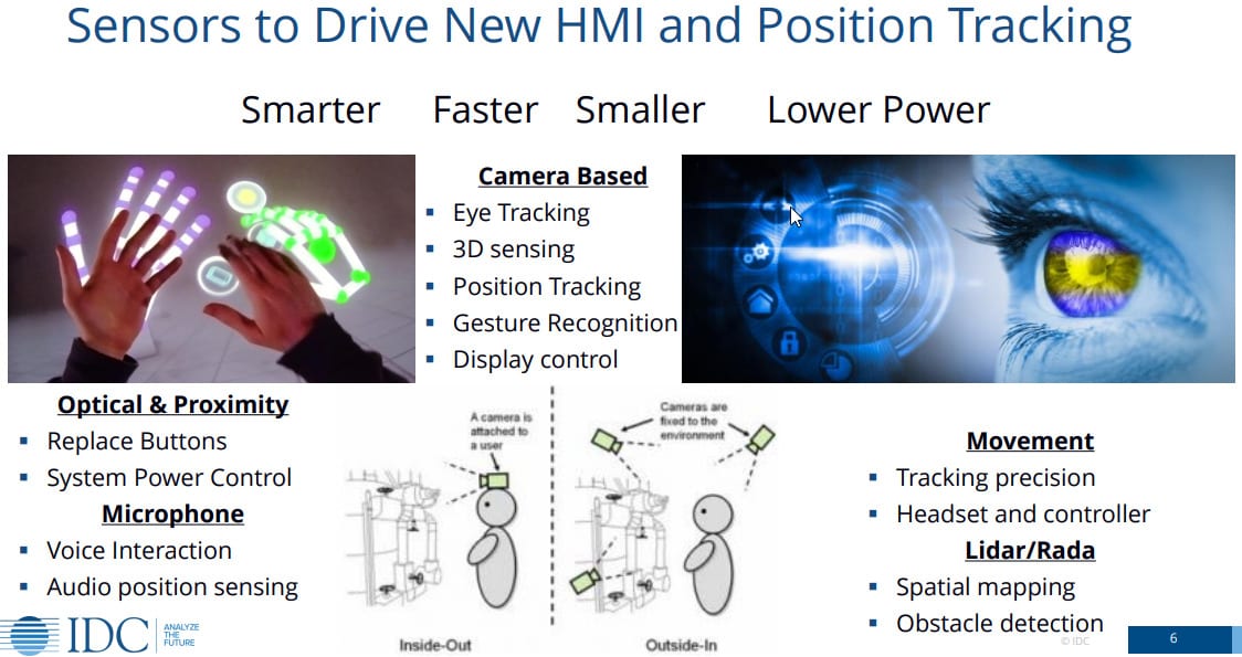 In a presentation titled, AR Traction Will Power Next Evolution of Devices, IDC Research Director for Enabling Technologies, Michael Palma, emphasized that the share of AR shipments for commercial customers had passed an inflection point and was in a growth spurt that was created a strong opportunity for suppliers. His research emphasized the movement of sensors to drive new human-machine interfaces (HMI) and position tracking. To meet the end-product demands, Palma emphasized the strong influence that AR applications would provide to processing, connectivity, and display developments.