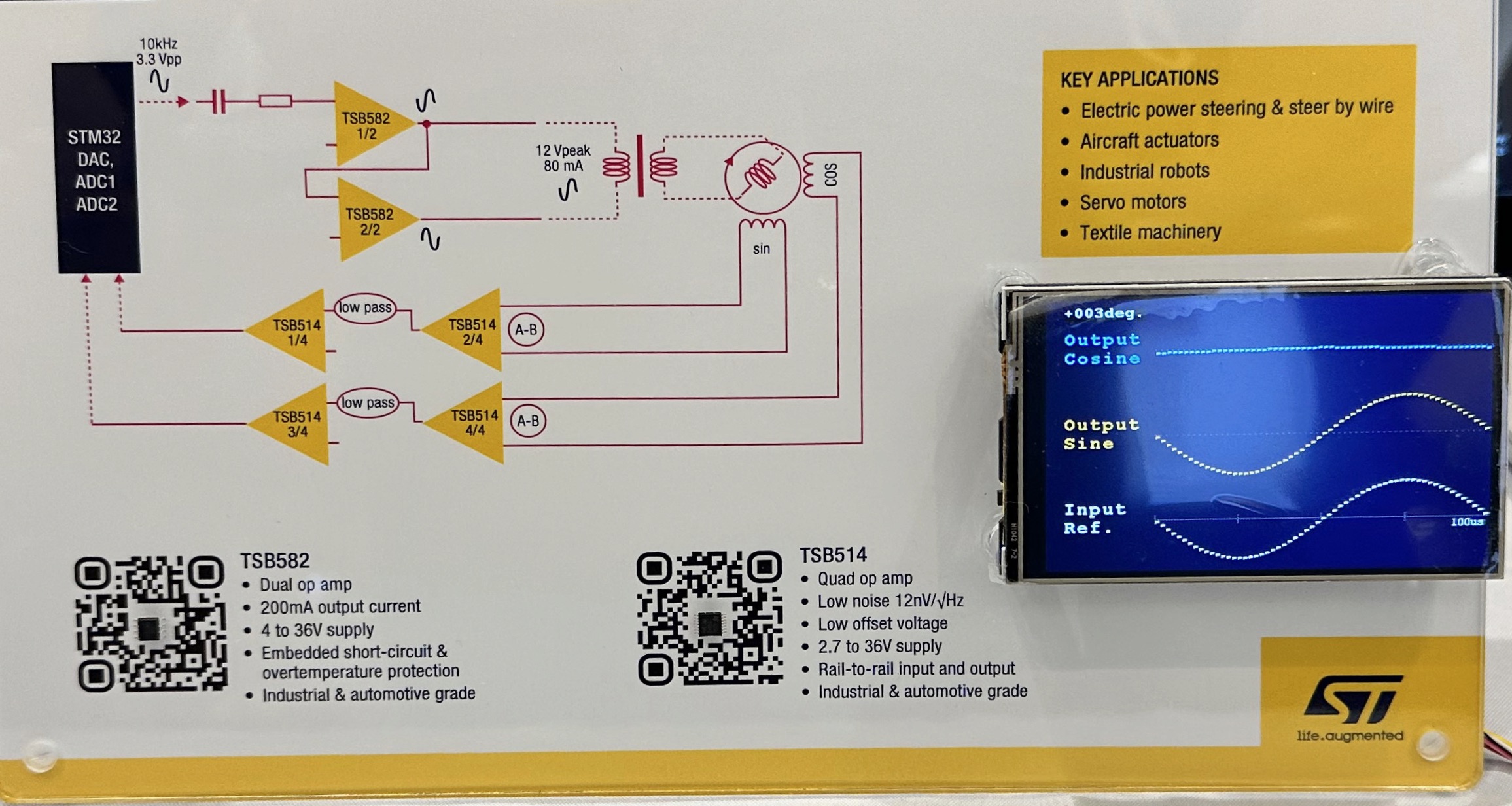 The TSB582 is ST’s first high-voltage and high-current dual-operational amplifier with one of the smallest packages in the industry (SO8 with exposed pad and DFN8 with wettable flanks and exposed pad). Our teams first considered it for resolvers in electric vehicles or other applications with high-powered AC or BLDC motor applications that must translate mechanical movement into electrical data to determine the motor’s position and improve efficiency. Moreover, its size and pin-to-pin compatibility with our other op-amps makes it a tremendous general-purpose device for piezo actuators, among other things. Consequently, we featured the TSB582 at Embedded World 2023 and the latest Toronto Technology Tour in a driving simulation demo.