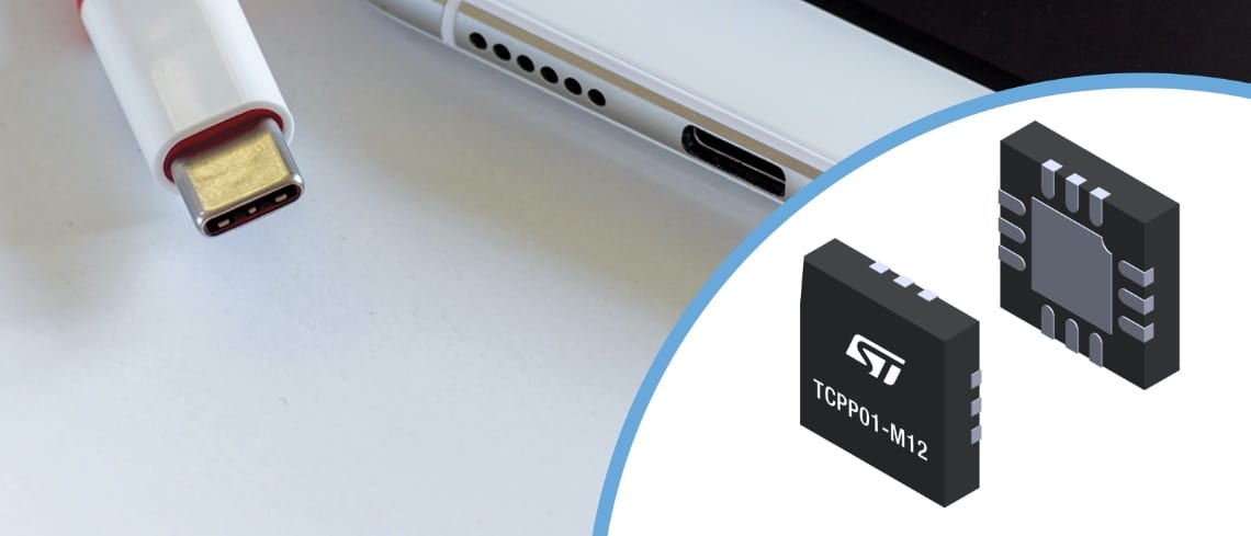 The TCPP01-M12 protects USB Type-CTM ports in sink mode (charging) against overvoltage of up to 24 V on VBUS, 6 V on CC lines, and against electrostatic discharges on the connector pins, among other things. TCPP stands for Type-C Port Protection, and the TCPP01-M12 works as a companion chip for our STM32 MCUs with built-in USB-C Power Delivery (UCPD). Hence, using an STM32G0, STM32G4, STM32L5, or STM32U5, and the TCPP01-M12 is significantly more cost-effective than a bundle of external devices. The TCPP01-M12 also distinguishes itself thanks to a null quiescent current when nothing is connected to the port.