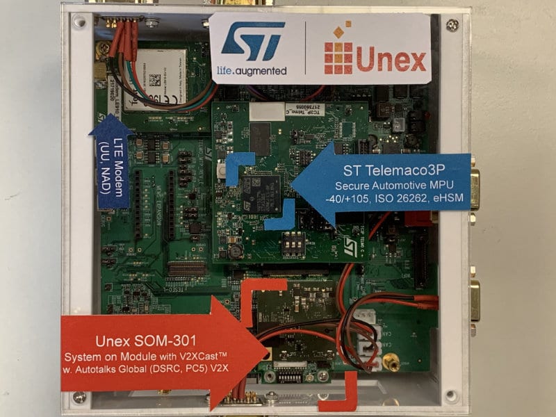 The SOM-301 uses a mPCIe form factor and one of its pins for power but relies on the USB interface of the Telemaco3P processor for data transfer. In fact, the ST processor can gather data from various sensors, the cellular modem, and the SOM-301 to fuse all data and provide more accurate information and services. It’s a fundamental aspect of the application as V2X must efficiently and precisely inform the driver, but also surrounding vehicles and infrastructure, which requires the processing of substantial amount of data from the car and numerous external sources. Unex also uses a CRATON2 processor with embedded V2X security, so engineers get all the security features necessary to meet the drastically stringent specifications of V2X standards.