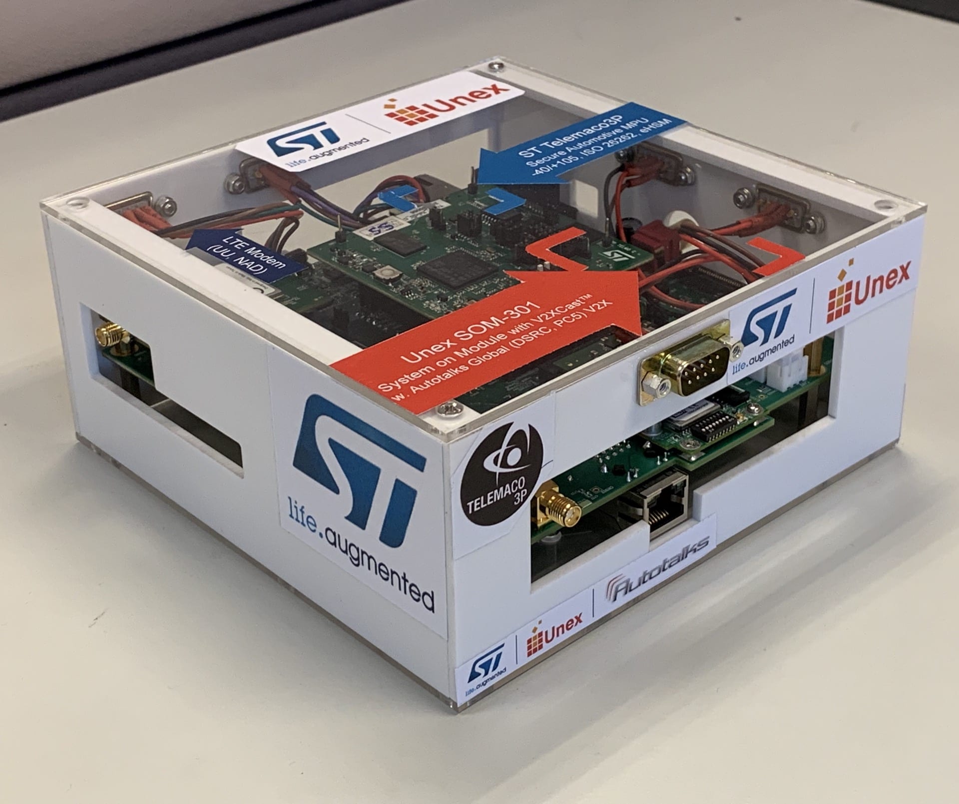 The SOM-301 uses a mPCIe form factor and one of its pins for power but relies on the USB interface of the Telemaco3P processor for data transfer. In fact, the ST processor can gather data from various sensors, the cellular modem, and the SOM-301 to fuse all data and provide more accurate information and services. It’s a fundamental aspect of the application as V2X must efficiently and precisely inform the driver, but also surrounding vehicles and infrastructure, which requires the processing of substantial amount of data from the car and numerous external sources. Unex also uses a CRATON2 processor with embedded V2X security, so engineers get all the security features necessary to meet the drastically stringent specifications of V2X standards.