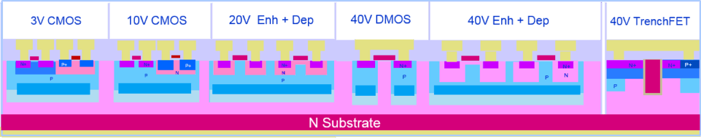 In the latest version of ST’s VIPower technology, 40V vertical or TrenchFET power devices are combined with 40V DMOS power devices, each with their driver circuitry, with 10V and 3V CMOS technology available for the logic and sensors. This smart combination of technologies enables high integration in a single package, that depending upon the product configuration, can provide higher energy efficiency, high actuation currents, serial and parallel interfaces, loads up to 50A DC load for 12V, 24V and 48V, and enhanced diagnostics.